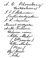 Leivonmäen kuntalaisten adressi 5.3.1899 H. M. Keisari-Suuriruhtinaalle – ote allekirjoittajista (Kansallisarkiston nide 15, mikrokortti 145, Leivonmäki, s. 383). Neljäntenä kirjoittajana J. V. Tenkasen puoliso Aino Maria Tenkanen, o.s. Nummelin.