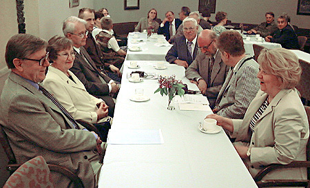 | Sukujuhlien vieraita. Etualalla vasemmalla kunniajäsen Aulis Tenkanen ja puolisonsa Pirkko Tenkanen (toisella puolen pöytää). Auliksen vieressä kunniajäseneksi kutsutun Osmo Tenkasen puoliso Leena, Leenan vieressä Osmo Tenkanen, ja Osmon vasemmalla puolella sukuneuvostoon uutena jäsenenä valittu Teijo Toivola. Teijoa vastapäätä Väinö Tenkanen, ja Väinön vieressä kunniajäsen Olli Tenkanen sekä Liisa Tenkanen. | ![]() |