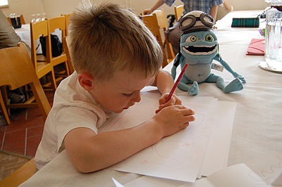 Markon poika Eemeli piirtää ja hullu sammakko saa hetken huilia...